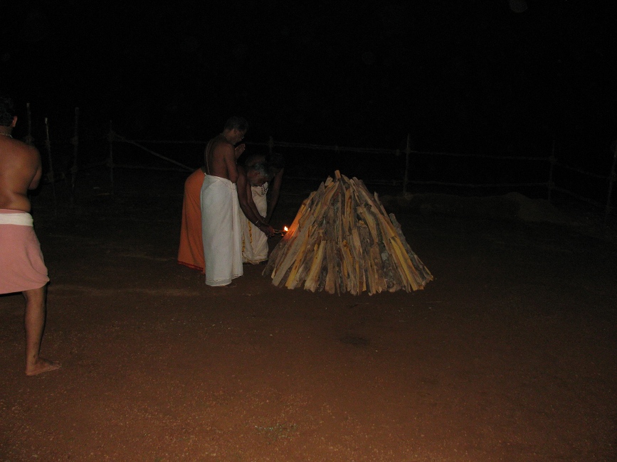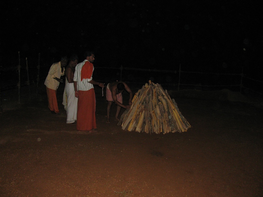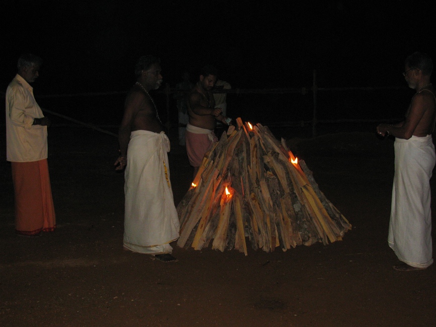 | 12.30 | Azhi Bali | This is performed to satisfy the gods. A heap of wood is burnt ritually. The Tantri performs the puja. The Acharya blesses the ritualists. They get possessed and steps on the burning logs. |