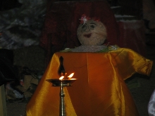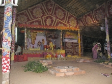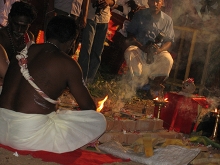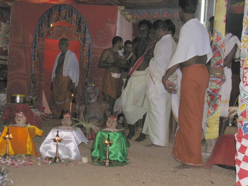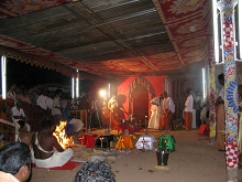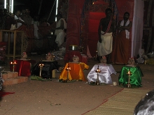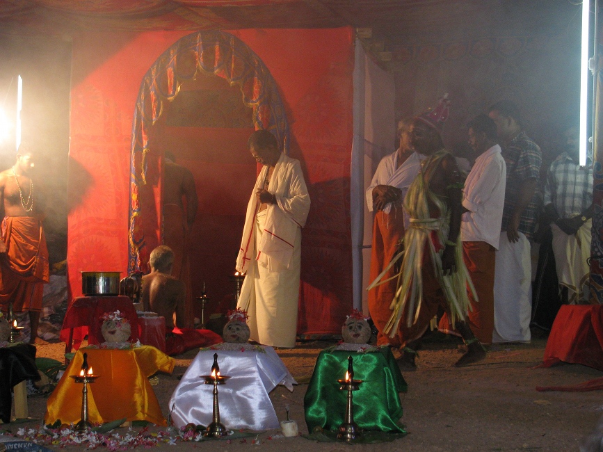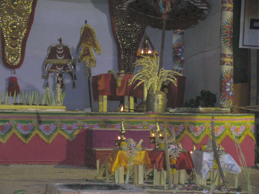 Vashyam, Akarshanam, Sthambhanam, Uchcatanam and Maranam. 5 stools are placed in front of Atavishvara. The stools are covered by silk clothes of red, black, yellow, white and green colour, Coconuts are placed on these stools. Two Kalashams are also placed. Two ritualists (sadashivan and Shashi) become possessed and perform the rituals. | |