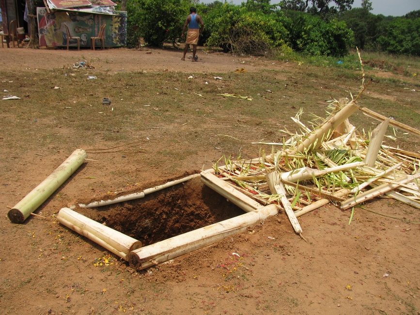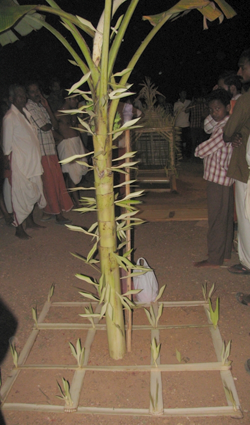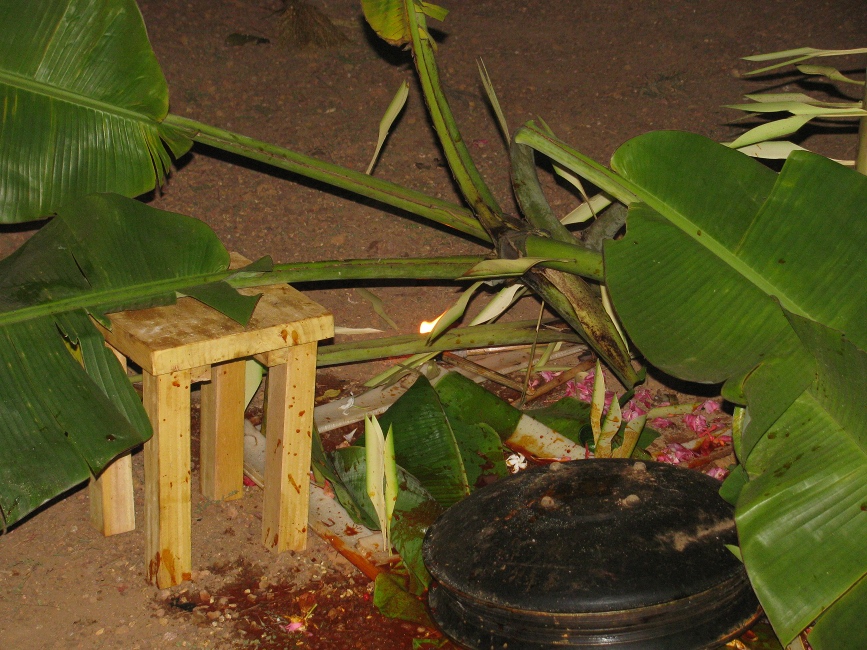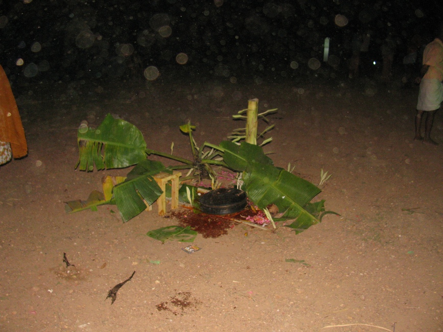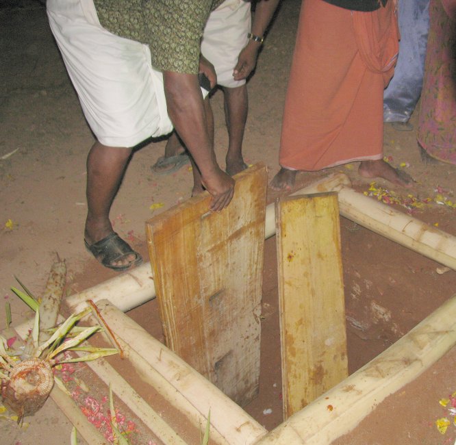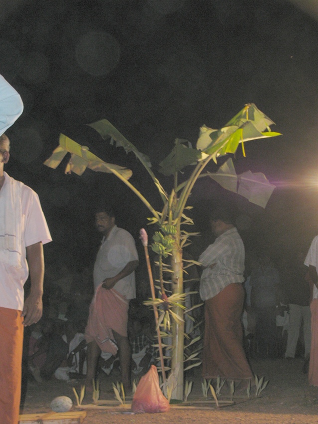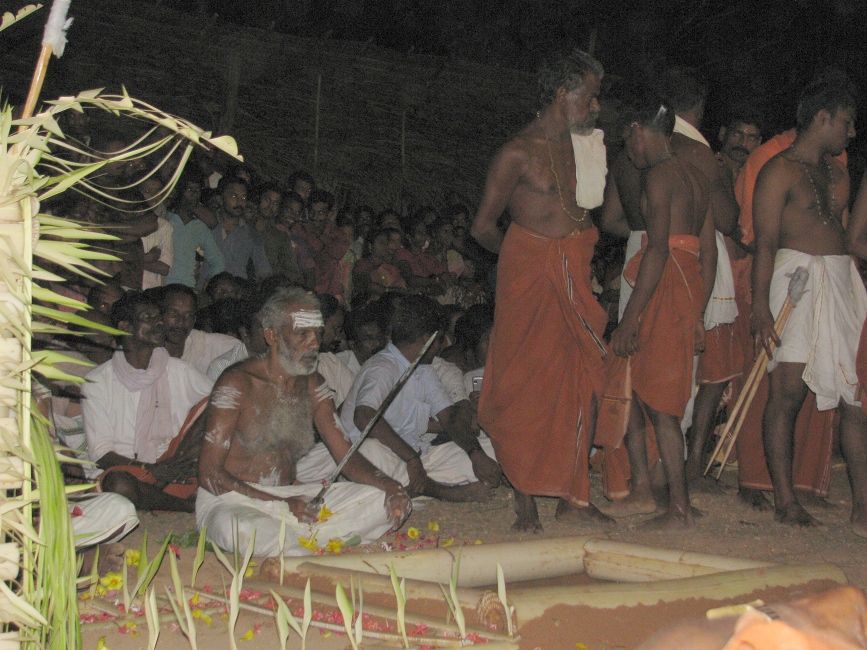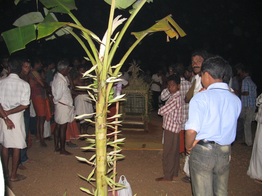 | 12.30 am to 2.00 am | Kuzhibalikkuta | This is performed for the benefit of those who are dead. Behind the Panappantal a structure is made of plantain stems. One ritualist (Sadashivan) sits inside. The other ritualist (Shashi) stands beside. Shashi gets possessed and is put inside the pit. He gets out and cuts of the plantain tree as well as the structure of plaintain stems. |